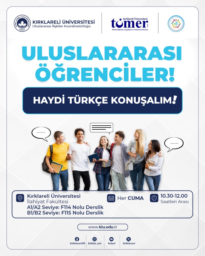 Türkçe konuşma pratiği yapmak, yeni arkadaşlar edinmek ve eğlenceli bir ortamda Türkçeyi geliştirmek isteyen tüm uluslararası öğrencilerimizi bekliyoruz!