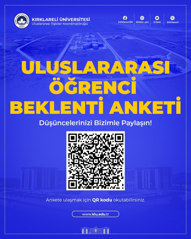Kırklareli Üniversitesi Uluslararası İlişkiler Koordinatörlüğü tarafından, üniversitemizde öğrenim gören uluslararası öğrencilerin beklenti ve ihtiyaçlarını belirlemek amacıyla “Uluslararası Öğrenci Beklenti Anketi” hazırlanmıştır.